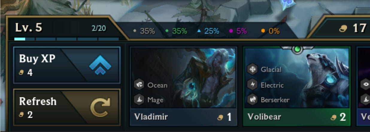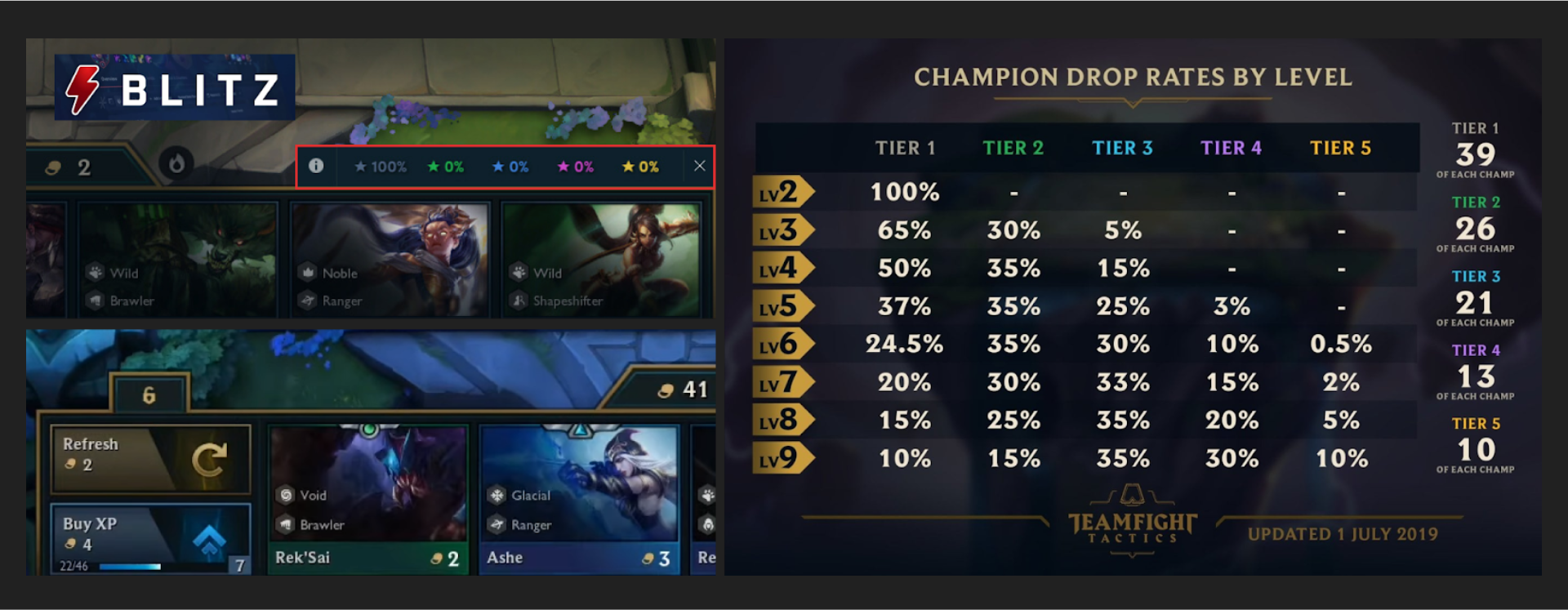 Don’t get me wrong, this isn't to say friction is always good. Thing can always be harder but that doesn't mean they should. I could force players to solve a Calculus problem each time they tried to buy an item in League of Legends, but that just doesn't sound fun. And while it wasn’t quite Calculus, we did create a different math sized problem when we launched TFT. On launch, TFT had no UI to display the tier probabilities of units in the shop.